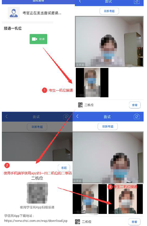 学校要求所有复试考生采用双机位,请考生使用谷歌浏览器,提前登录学信网客户端https://bm.chsi.com.cn/ycms/stu/ ,考生需要用两台设备进行远程面试,可以是电脑+手机、笔记本+手机、手机+手机。(同等学位的考生在复试考试中仍使用单机位,在同等学力加试中使用双机位)