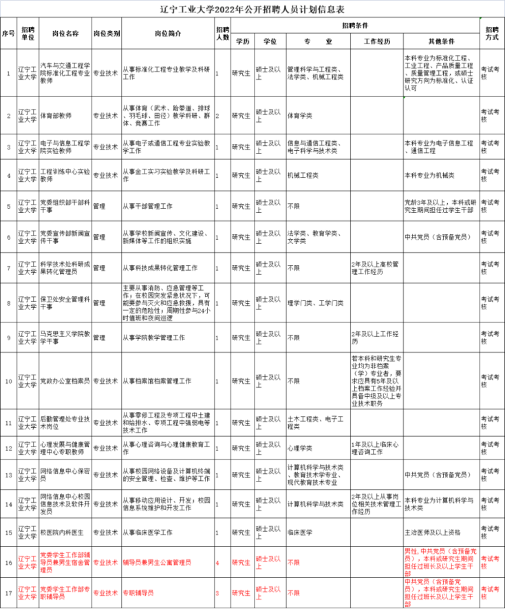 (五)岗位所需要的其他条件,详见《辽宁工业大学2022年公开招聘人员计划信息表》。