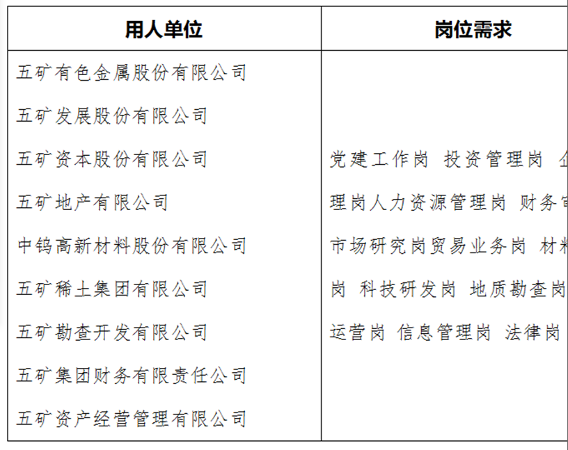 (更多职位信息见企业招聘官方网站:zhaopin.minmetals.com.cn)