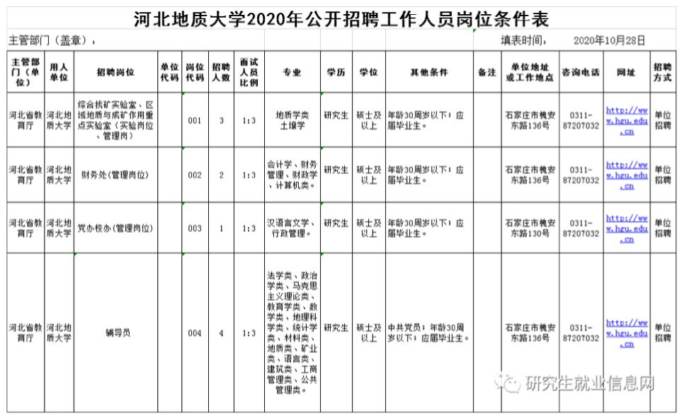 通过河北人社网(http://rst.hebei.gov.cn)和河北地质大学官网(http://www.hgu.edu.cn/)面向社会公开发布招聘信息。